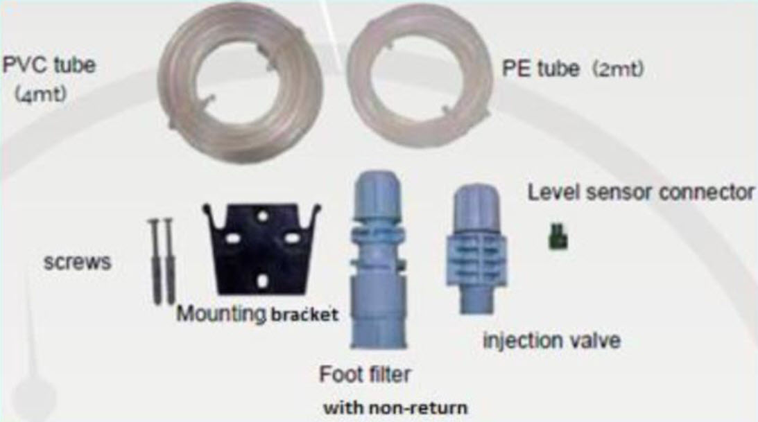Součástí dodávky dávkovacího čerpadla je instalační sada (4 m PVC sací hadičky, 2 m PE výtlačné hadičky, držáček včetně šroubků, sací koš a vstřikovací ventil).