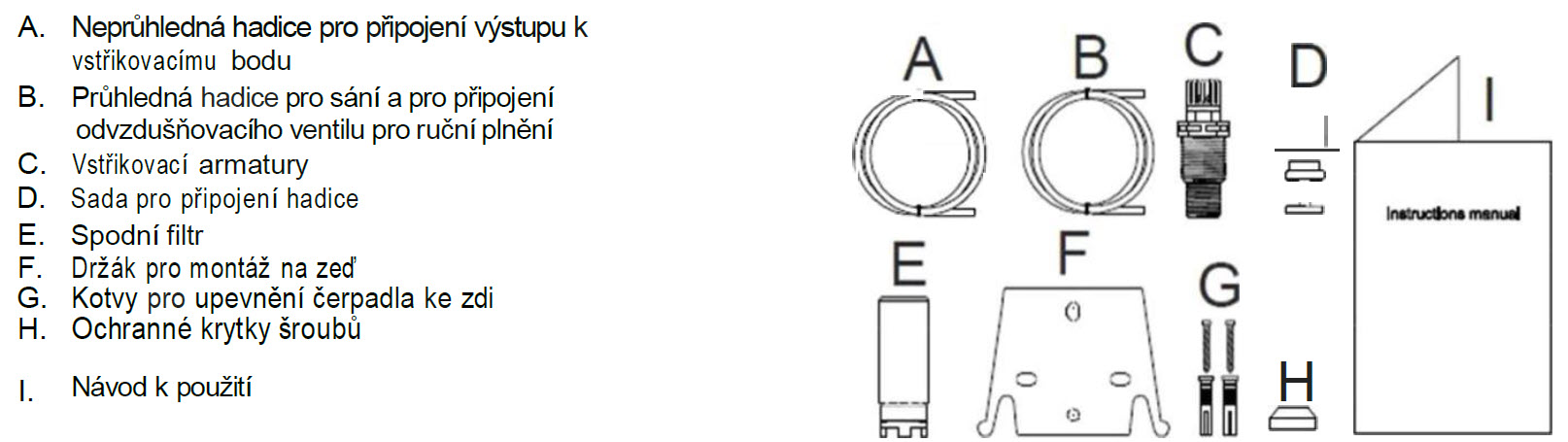 Součástí dodávky dávkovacího čerpadla je instalační sada (4 m PVC sací hadičky, 2 m PE výtlačné hadičky, držáček včetně šroubků, sací koš a vstřikovací ventil).