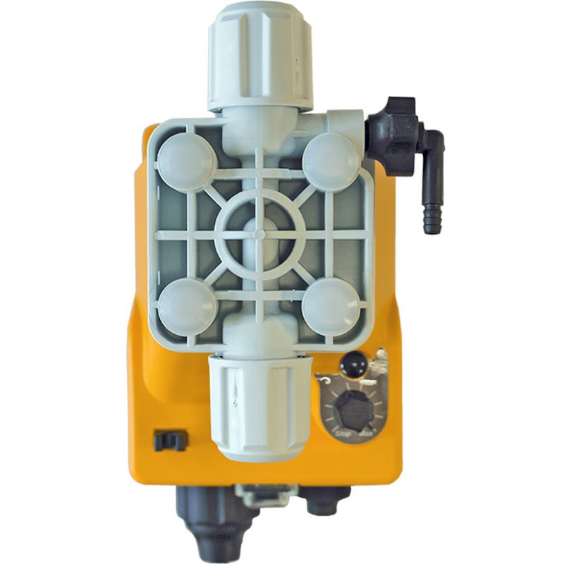 Analogové solenoidové dávkovací čerpadlo s konstantním dávkováním, ručně nastavitelné pomocí ovládacího knoflíku na předním panelu.
