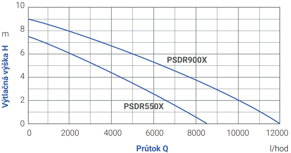 Průtok 0 až 12 m3/hod., dopravní výška 9 až 0 m. Max. velikost nečistot 5 mm. Min. výška hladiny je 11 mm.