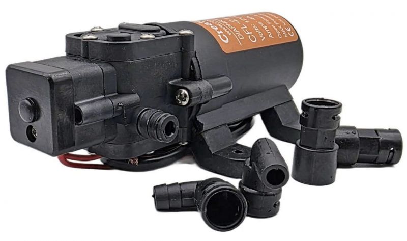 Tlakový spínač, samonasávací čerpadlo - 1m, max. průtok 4,3 l/min., max. tlak 2,4 baru, napájení 12 V.