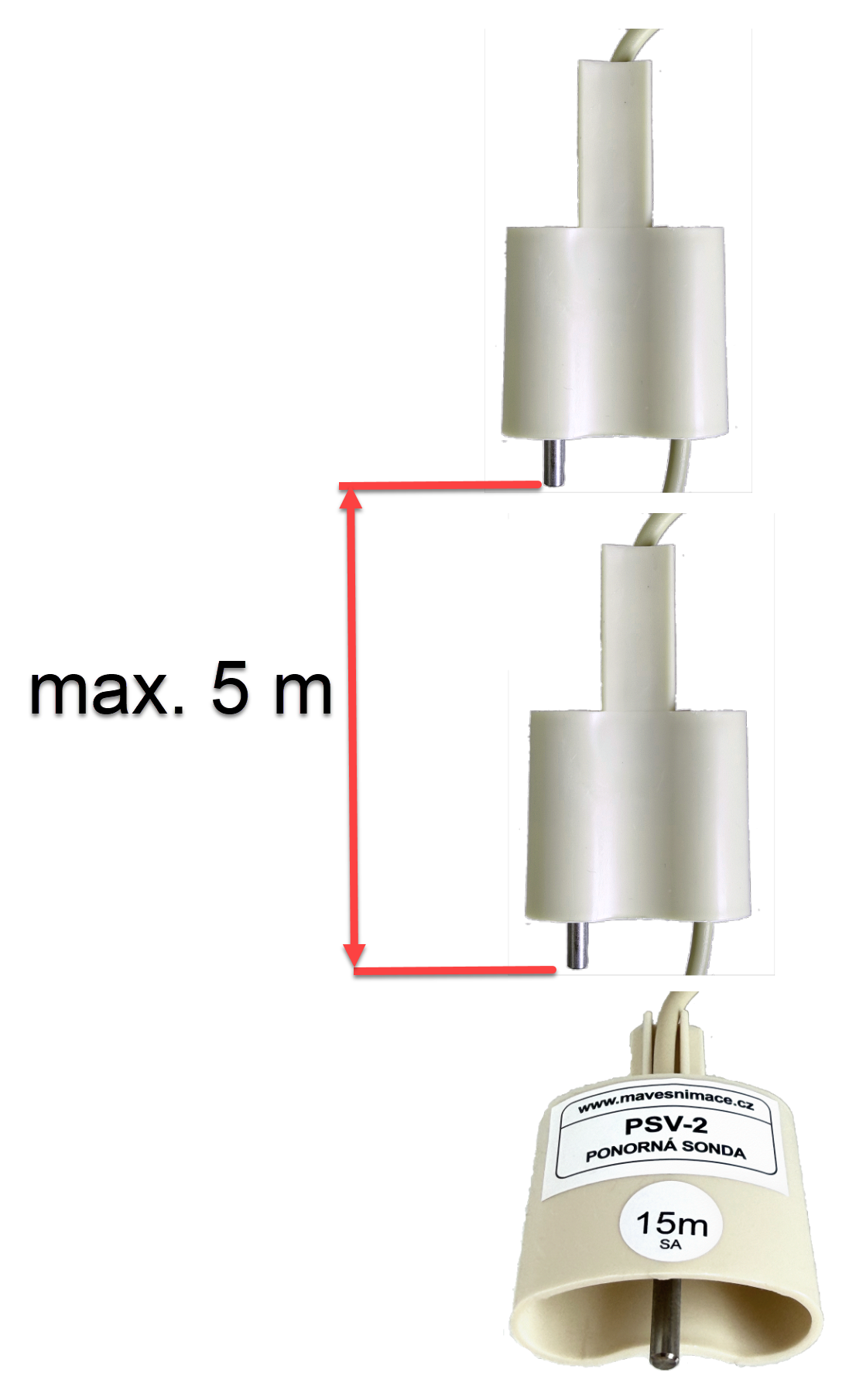 Jednoduché sondy slouží k indikaci jedné hladiny, dvojité ke snímání dvou hladin o max. rozdílu 5 m (označení délka kabelu + 5 m). V případě požadavku menšího rozdílu lze kablík zkrátit (např. smotáním), v případě většího rozdílu než 5 m je třeba použít na indikaci dvě jednoduché sondy.