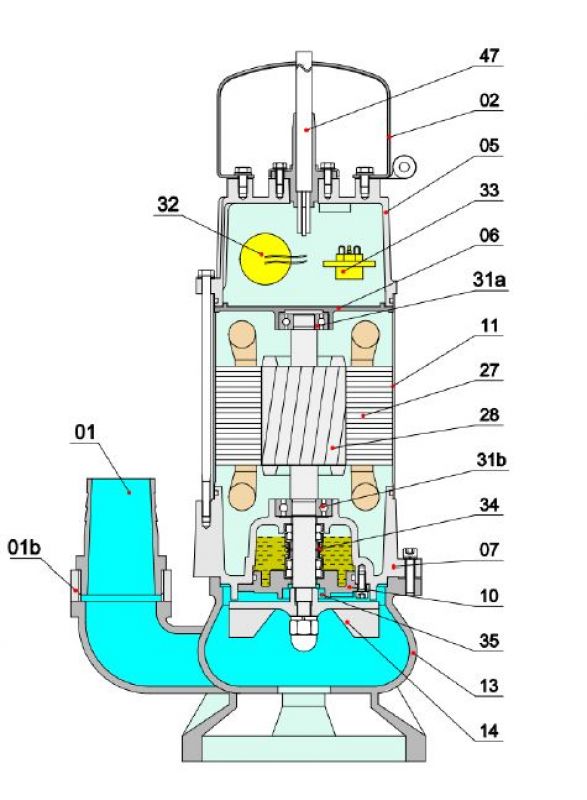 . Kalové čerpadlo s vířivým oběžným kolem Vortex. Max. velikost nečistot 80 mm. V čerpadle je v olejové komoře čidlo průsaku, které slouží k detekování vlhkosti, kdy vyšle signál k vypnutí čerpadla.